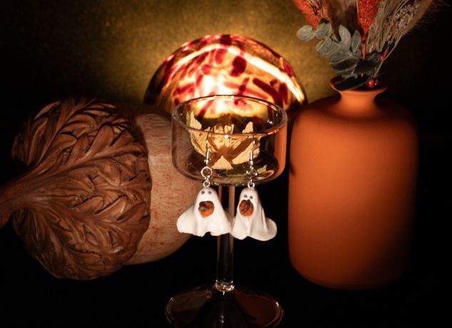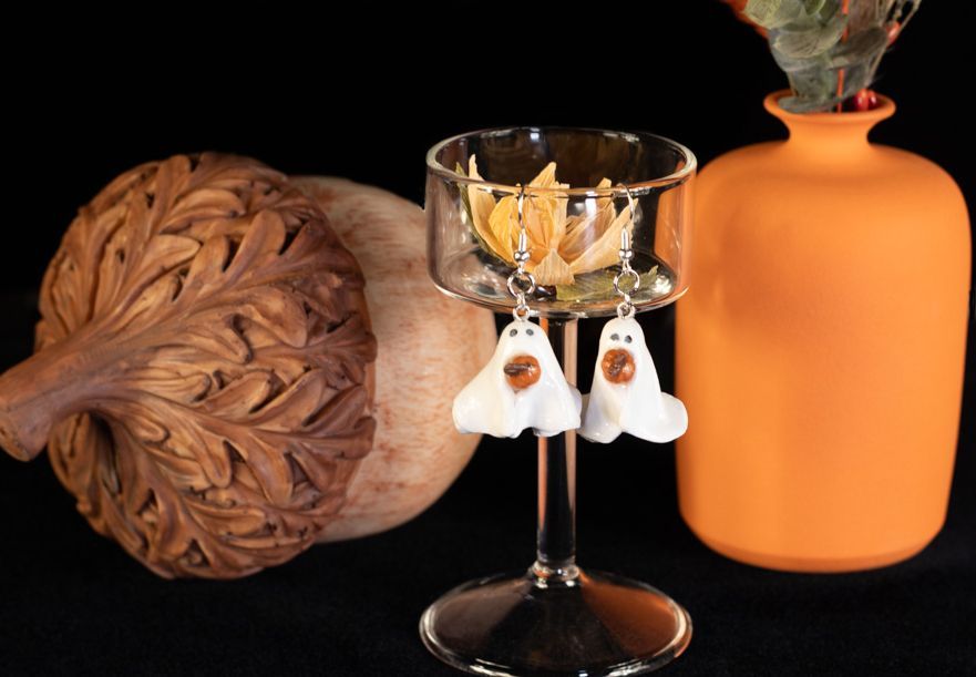 Elevated and seasonal, the Golden Gourd earrings blend the playful spirit of Halloween with the warmth of autumn harvest. Each handcrafted clay ghost carries a tiny pumpkin, a nod to the glowing gourds of fall.