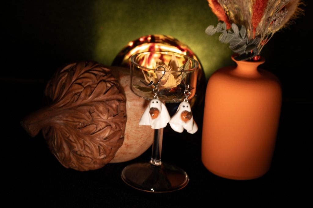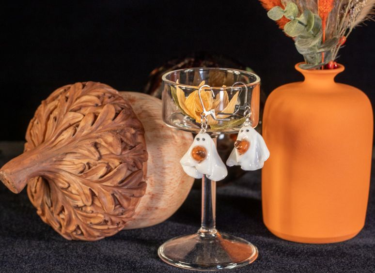 Elevated and seasonal, the Golden Gourd earrings blend the playful spirit of Halloween with the warmth of autumn harvest. Each handcrafted clay ghost carries a tiny pumpkin, a nod to the glowing gourds of fall.